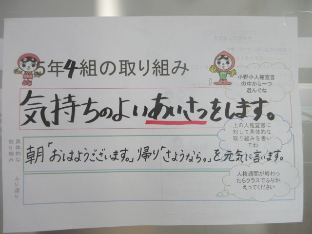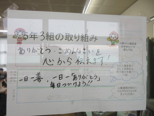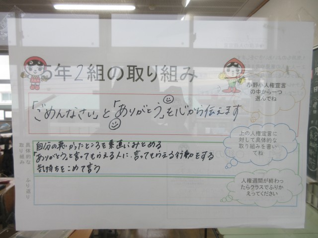 人権週間の各クラスの取り組みの紹介です。振り返りを一人一人はもちろん各クラスで行って、小野小が今まで以上に一人一人が輝く、みんなが輝く学校になるように思いやりをもって行動できるといいですね。