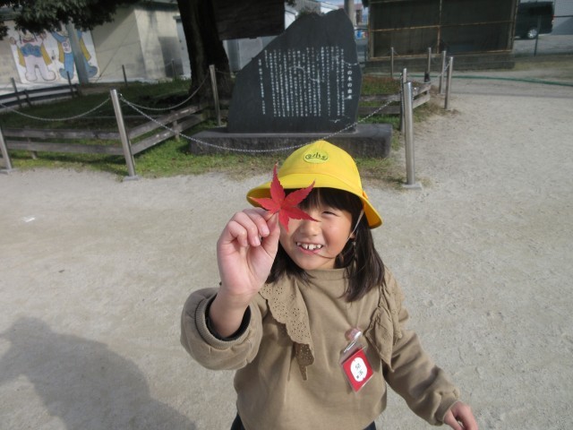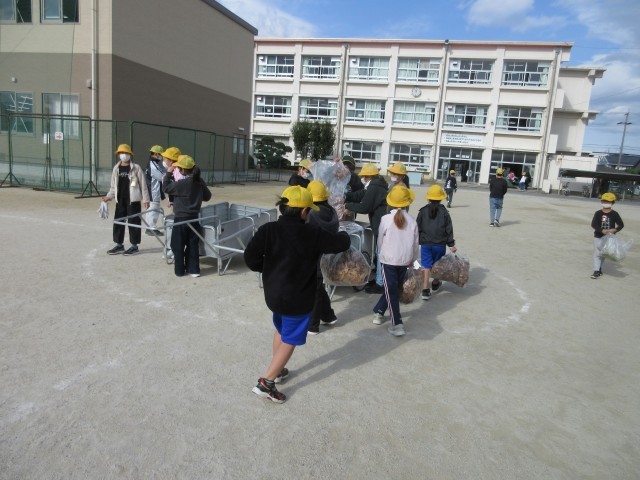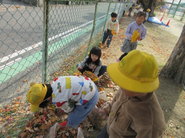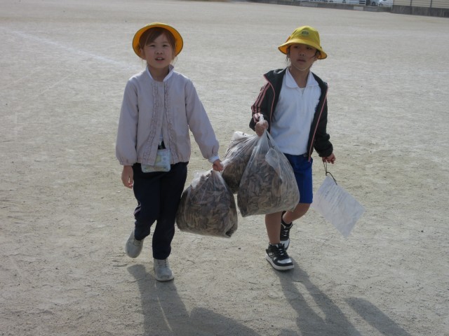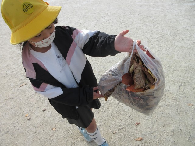 外そうじの一コマです。今、たくさんの落ち葉があります。みんなで協力して落ち葉を集めています。いつも集めているビニール袋はすぐにいっぱいになってしまうので、大きなふくろを持ってそうじをしています。みなさん、ありがとうございます。