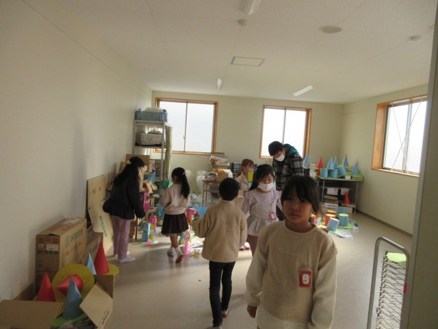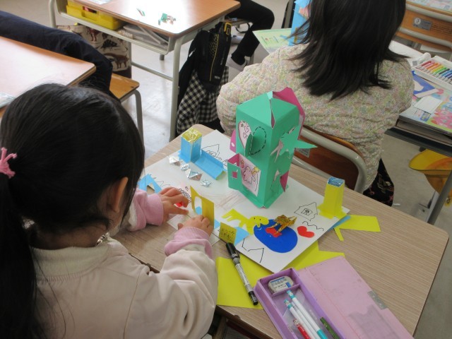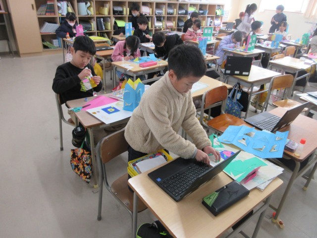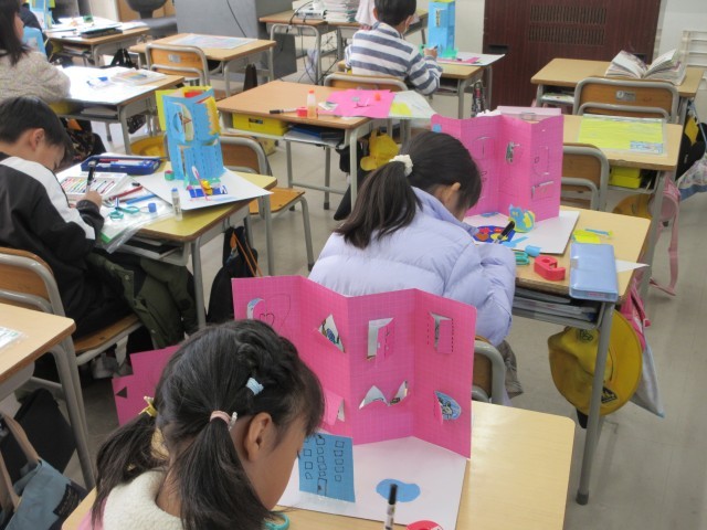 2年生の授業の様子です。図工では「まどをあけたら」の作品を作っていました。カッターナイフの使い方を学び、できるようになったことをいかして、窓をあけ、窓の開けたところに何が見えるのか工夫しましたね。