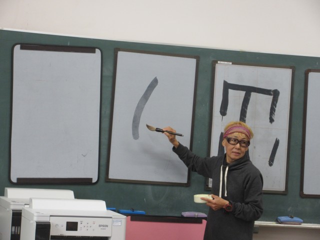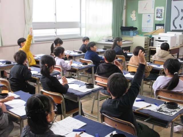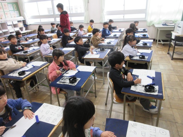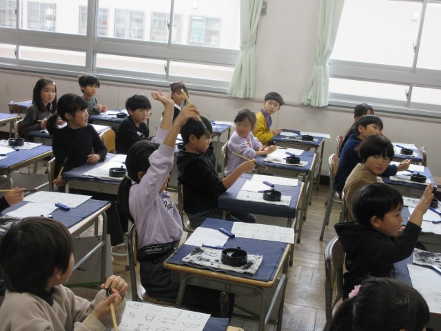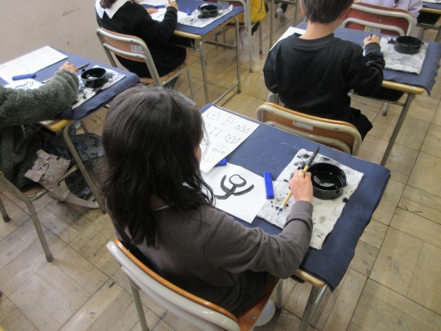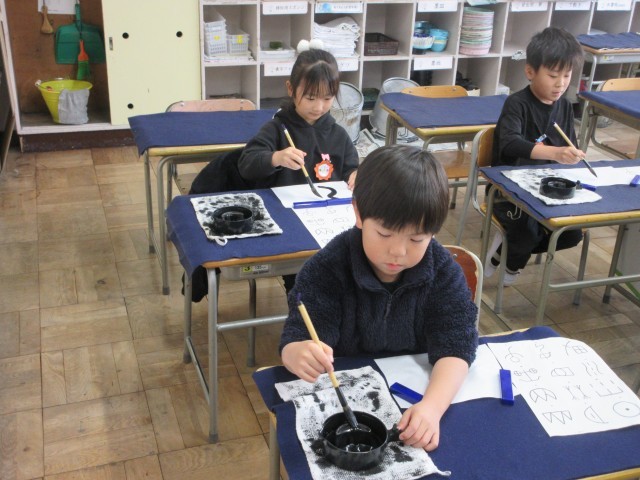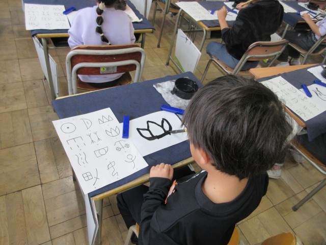 1年生の書作品づくりの様子です。いよいよ清書に入ります。清書はうちわに書きます。その前の練習もゆびで書いたり、筆で書いたりと慎重に、そして楽しみながら進めています。