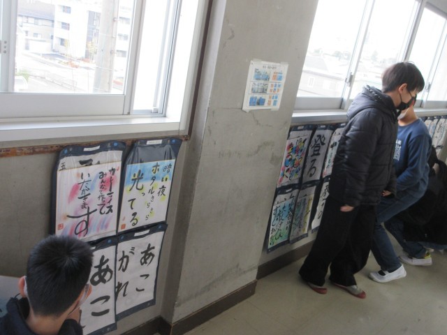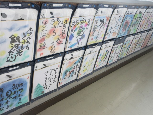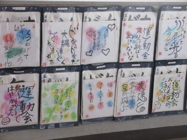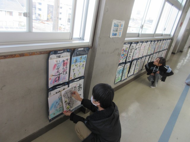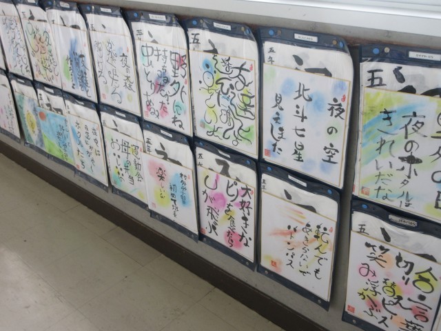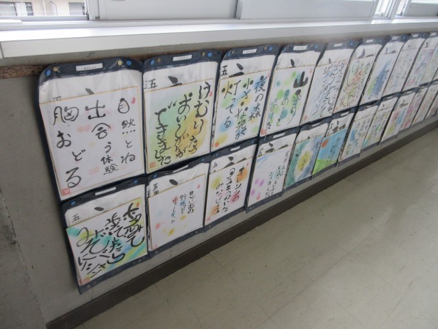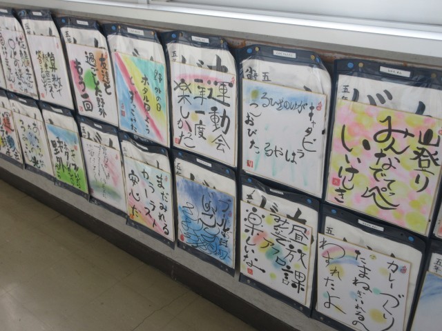 書作品を掲示しています。北館3階のろうかには5年生の作品が紹介されています。ぜひ近くに行って、直接己書の力作を御覧ください。