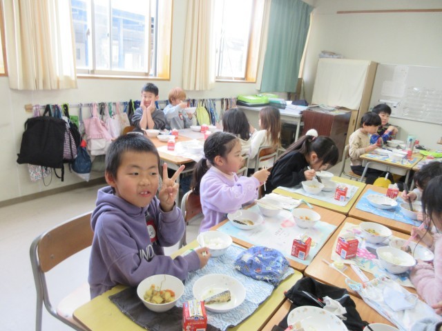 12月19日(金)給食の一コマです。みんなでおいしく給食を頂いています。2学期の給食も来週の月曜日12月22日でおしまいです。最終日はセレクトデザートの日になっています。「いちごプリン」又は「チョコクレープ」、どちらも楽しみですね。