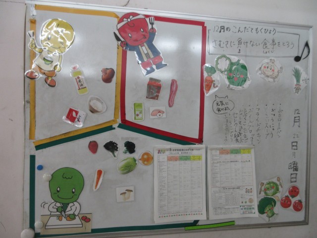 12月22日(月)今日で2学期最後の給食ですね。給食一言話は、少し早いですがクリスマスを意識した給食についてです。12月25日はクリスマスで、イエス・キリストが生まれたことを祝うキリスト今日の大切な日です。日本でのクリスマスは1552年山口県でフランシスコ・ザビエルが行ったことがはじまりだと言われています。アメリカでは七面鳥、イタリアでは魚や野菜料理を食べます。チキンや丸くて白いケーキを食べるのは日本での風習だそうです。