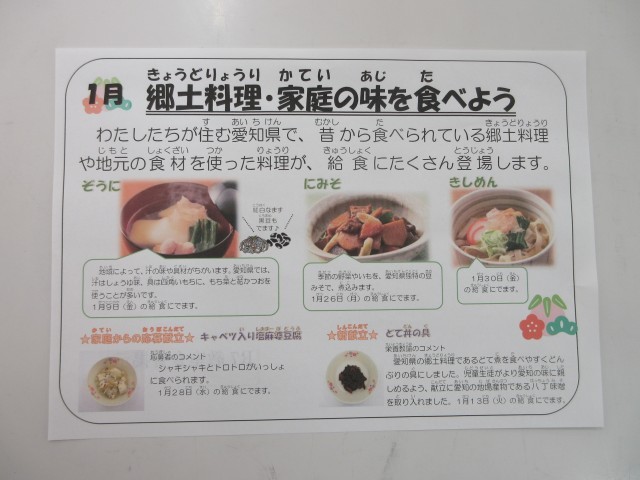1月の献立目標は「郷土料理・家庭の味を食べよう」です。わたしたちが住む愛知県で昔から食べられている郷土料理や地元の食材を使った料理が給食にたくさん登場します。楽しみにしてくださいね。