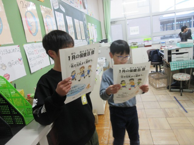 1月8日(木)1月の保健目標「外で元気よく遊ぼう」を各教室で保健委員のみなさんが発表します。朝のうちに保健室で各教室で伝える練習をしていました。みんなのメッセージが小野っ子に伝わるといいですね。全校のみなさん、今日も外で元気よく遊んで、体が温まり病気と戦う免疫力をアップさせましょう。