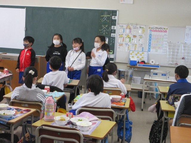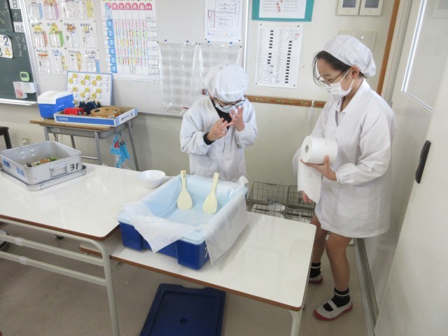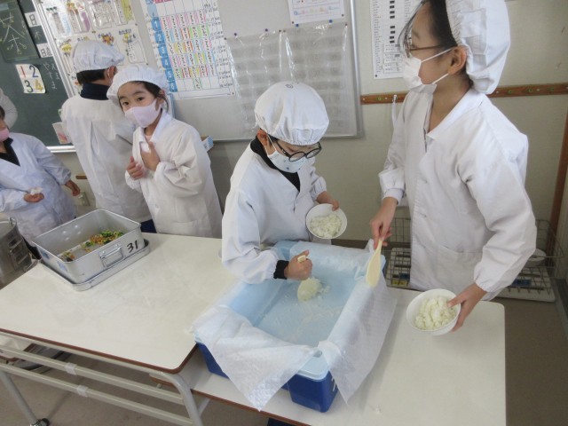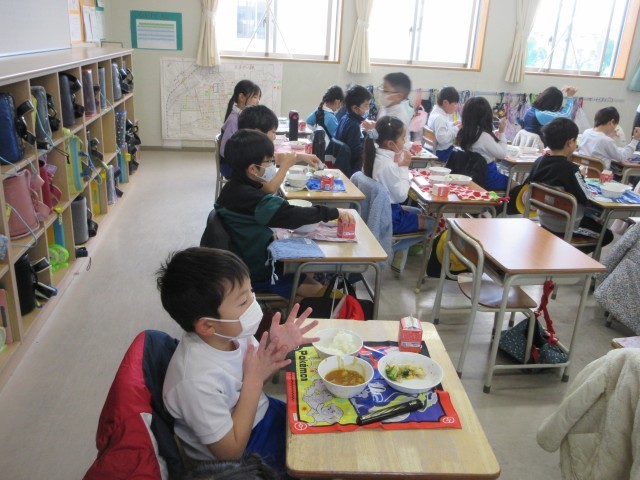 2年生の教室では、給食当番さんがごはんを全部上手につけきったり、新しい3学期の係さんに前の係さんが仕事を教えてあげたりと素敵な一コマがありました。