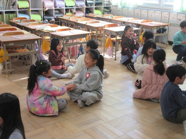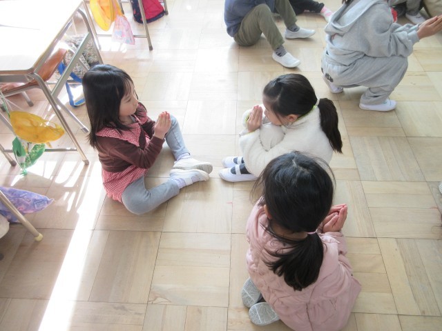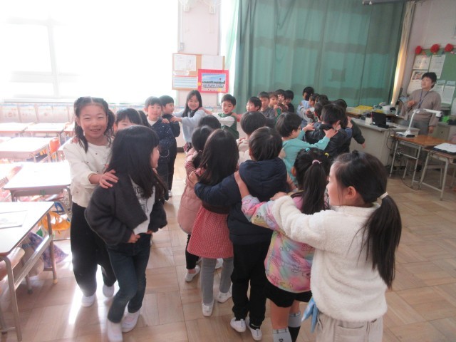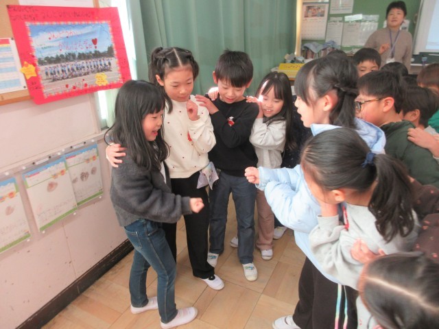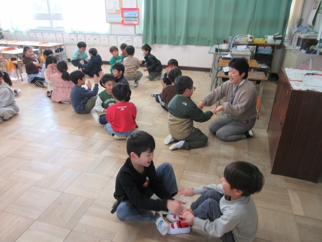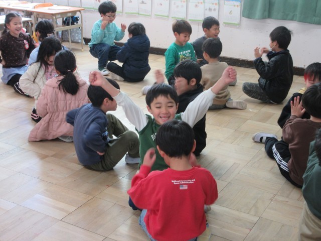 1年生の授業の様子です。音楽では今まで習った曲に合わせて歌を歌ったり動作を付けたりしてみんなで楽しみました。「かもつれっしゃ」の曲では最後は一つにつながったり、「おちゃらか」ではペアーになってじゃんけんをしたりしましたね。先生も一緒にじゃんけんをしながら楽しい音楽の時間になりました。