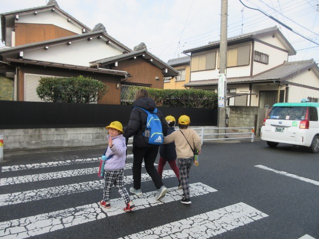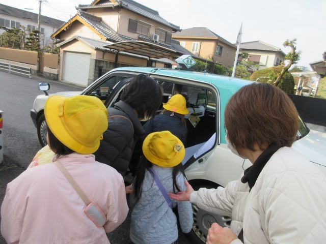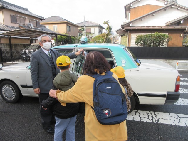 タクシーが正門前に到着しました。みんなで出発です。気を付けていってらっしゃい。