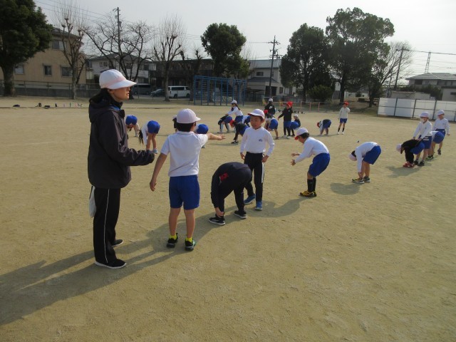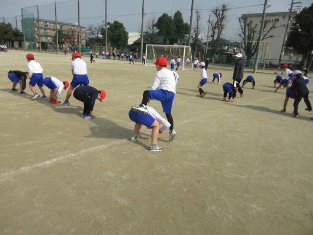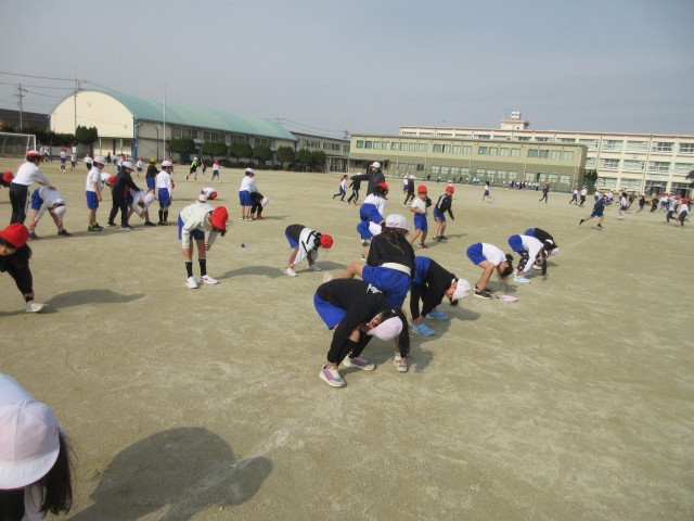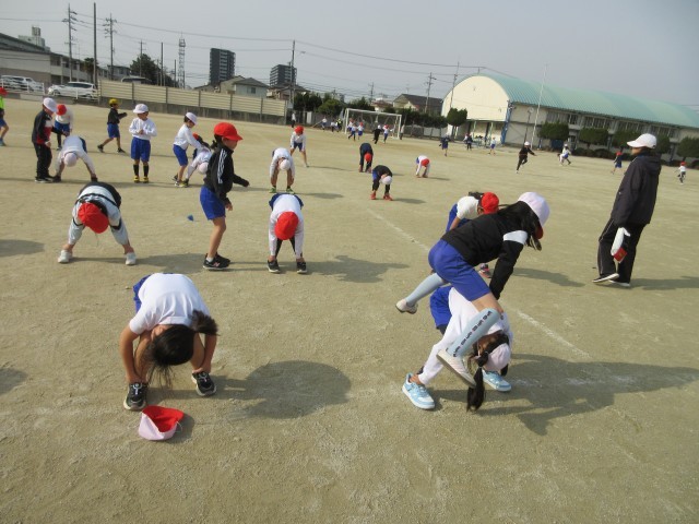 2年生の授業の様子です。運動場では馬跳びをしたり、なわとびをしたり、ボールを使った運動をしたりしています。