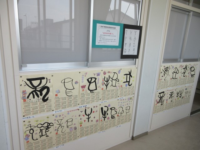 2年生の書作品です。テーマは「古代文字を書こう」です。波多の明翠先生に指導していただき古代文字に挑戦しました。選んだ動物の名前の古代文字を一画ずつ筆遣いや大きさを工夫して楽しみながら書くことができました。作品の下は2026年のカレンダーになっています。お家で使ってくださいね。