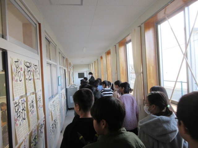 授業参観に合わせて、小野小では校内作品展見学をしました。1年生から5年生までの教室前廊下には書作品が掲示されています。6年生の作品とクラブの作品は体育館にあります。クラス単位で見学をしました。6年生の大きな作品にびっくりしたり、次はこの作品をつくるんだと期待していたり、高学年のみなさんは、去年この作品を作ったなあと思いだしたりしました。全校の力作ぞろいの書作品を近くで見ることができました。来年の書作品作りが今から楽しみになりましたね。