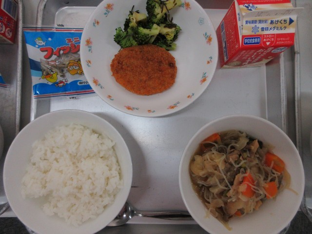 今日の給食は、ごはん、牛乳、牛肉とたまねぎのうま煮、コロッケ、ブロッコリーの塩昆布あえ、いわしの干し小魚です。今日の干し小魚には少し大きいものがあったようで、苦手かと思いきや、他の子に自慢する児童の姿が複数ありました。しっかり食べてくれて嬉しいです。