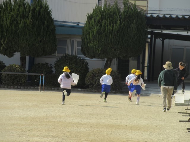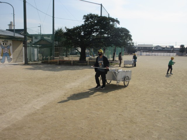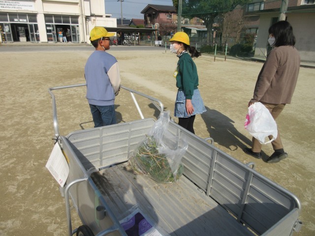 外そうじの一コマです。そうじの終わりの音楽が流れてくるとみんなは、委員会のお兄さんやお姉さんのリヤカーに集めた草や落ち葉を持ってきます。