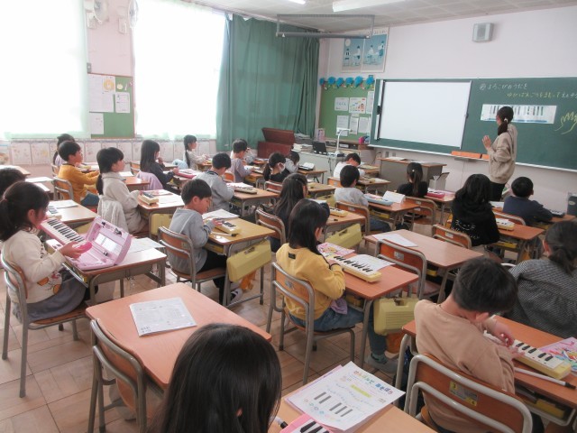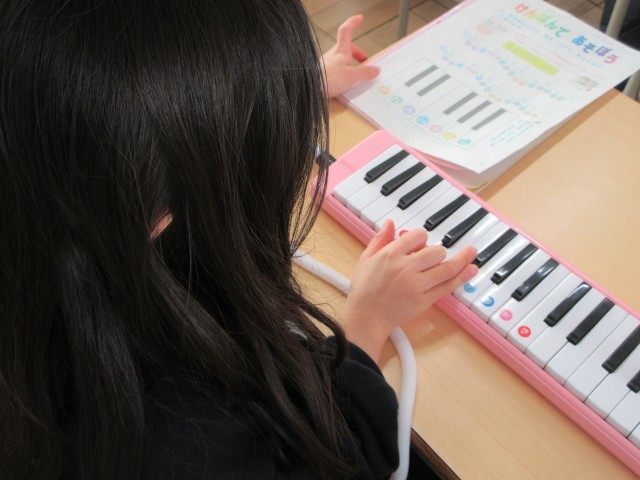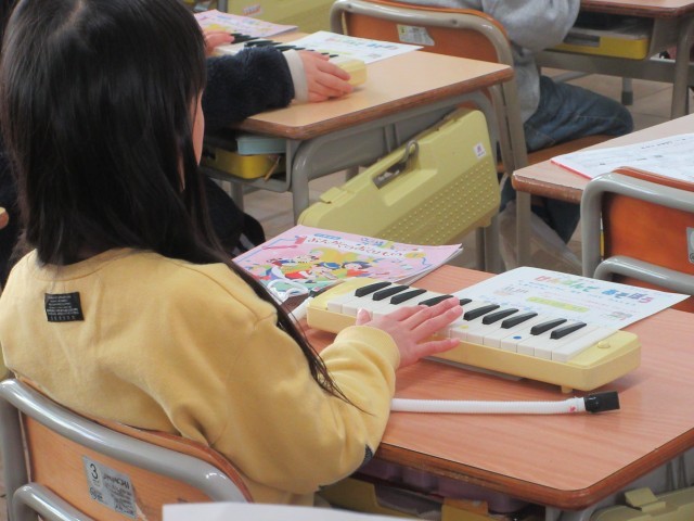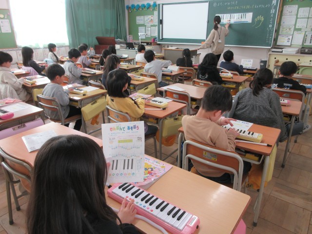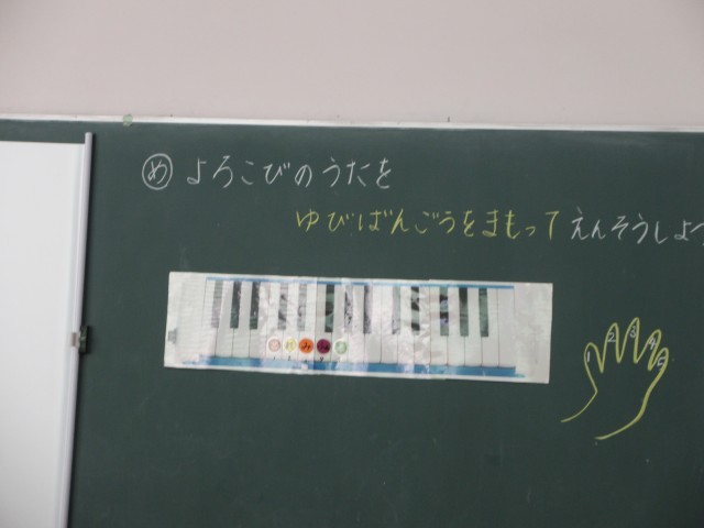 1年生の授業の様子です。音楽では「ピアニカ」の練習をしています。今回のめあては「よろこびの歌を指番号をまもって演奏しよう」です。最初は歌を歌って番号を確認、次は歌いながらピアニカで指使いを確かめました。いよいよこの後よろこびの歌の演奏です。
