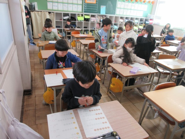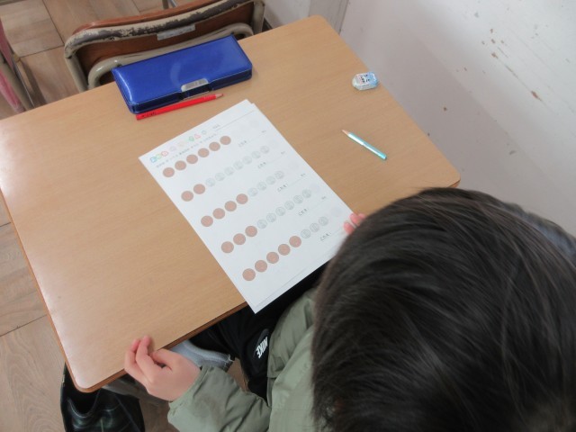 1年生の授業の様子です。算数では、学びのまとめをしていました。お金の種類を学び、1円硬貨、5円硬貨、10円硬貨、50円硬貨、100円硬貨、500円硬貨の種類で数を数えることに挑戦しています。実際の買い物にも役立ちますね。