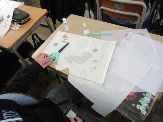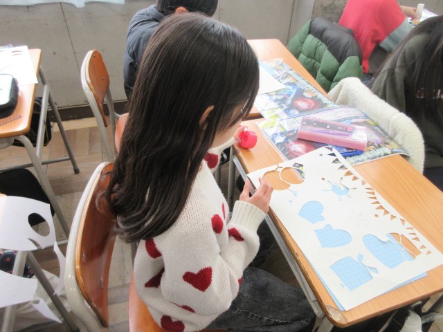 5年生の授業の様子です。図工では「紙から生まれるすてきな明かり」の作品作りをしています。様々な紙の種類にあわせて、光を通したらどのような明かりができるのか想像しながら模様を切り出していました。