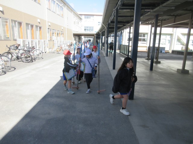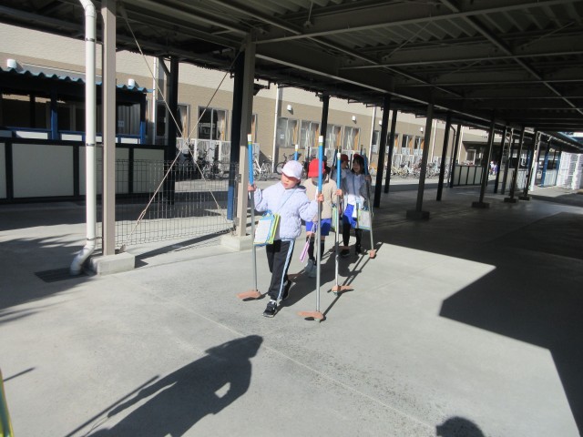 2年生の授業の様子です。体育では竹馬や一輪車、なわとびと色々な種目に挑戦しています。たくさんの道具も使うので、みんなで協力して準備をしています。