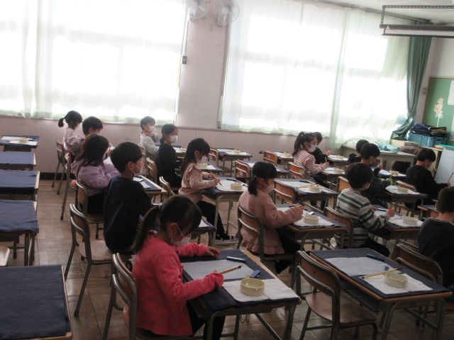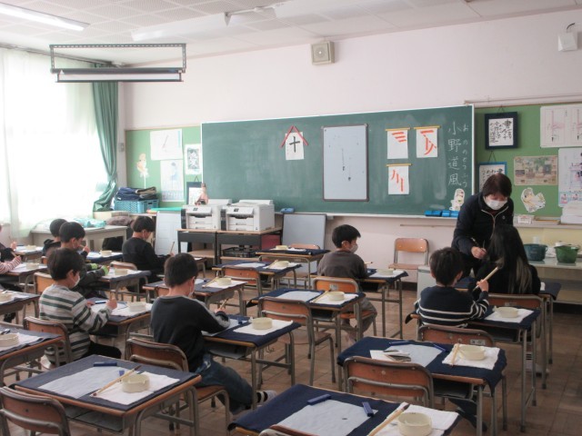 1年生の授業の様子です。書の時間には特別講師の吉岡先生といっしょに学んでいます。水習字で「十」の文字を書いています。姿勢、筆の持ち方、試筆などポイントを確認して書いています。