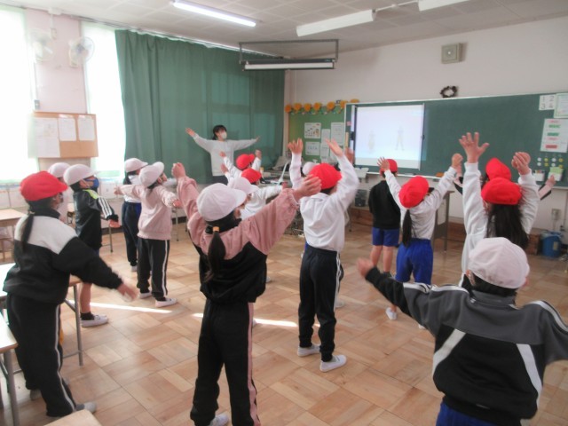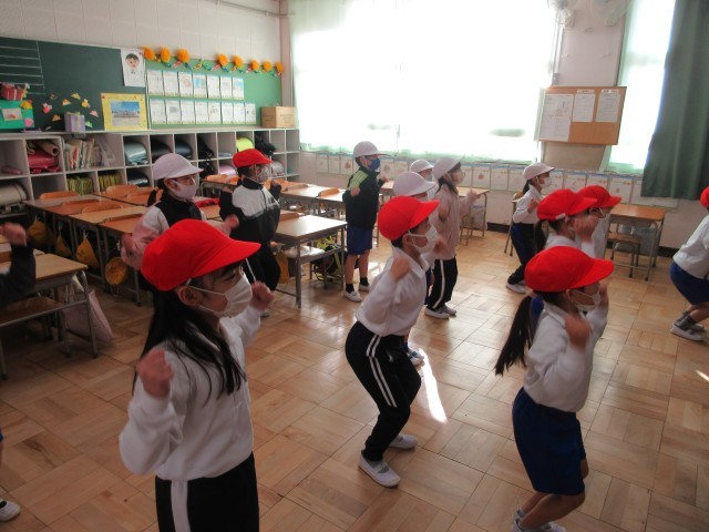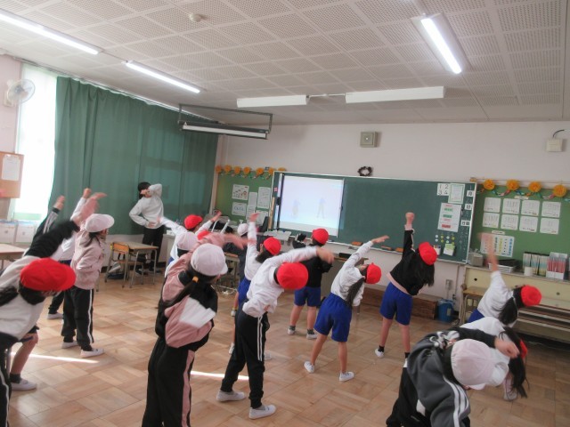 1年生の授業の様子です。運動場で体育をする前に準備体操をしていました。ラジオ体操第一、そして第二まで先生といっしょに行っていました。ラジオ体操の音楽を聴くと自然に身体が動きますね。