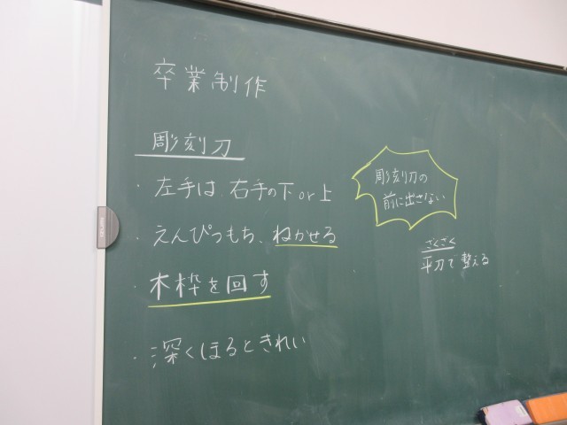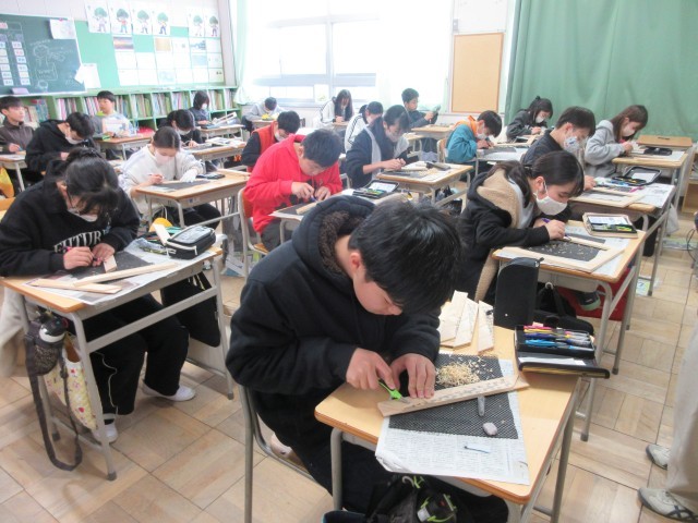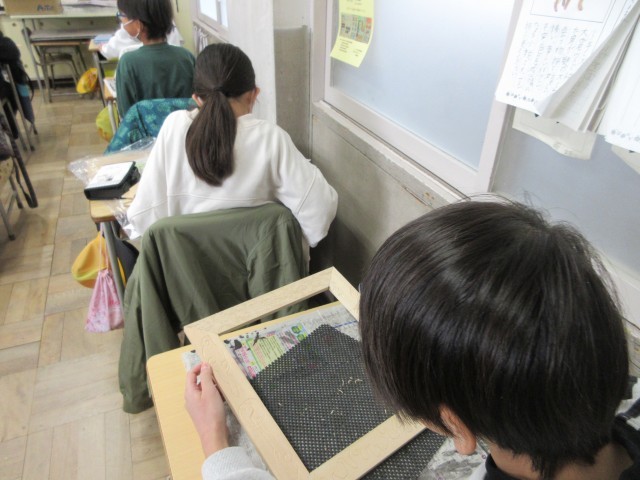 6年生は卒業制作を始めています。色紙を入れるフレームを作っています。木の枠を色々な種類の彫刻刀を使って掘っています。フレームができあがると、色紙の文字をかき、卒業制作が完成します。一つ一つ丁寧に仕上げています。