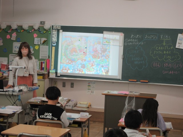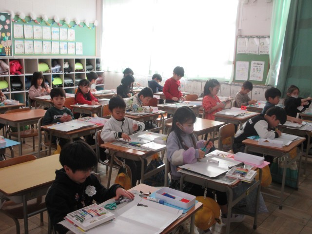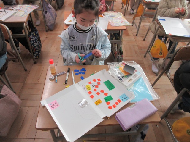 1年生の授業の様子です。図工では「わくわく おはなしすごろく」の作品を作っています。すごろくのルールお話を考えながら「〇つ進むのか?」「ここに止まったらスタートにもどる」「ごほうびに〇〇先に進めるようにしたい」など楽しく作品づくりをしましたね。出来上がったらすごろくをして遊ぶ予定です。楽しみですね。