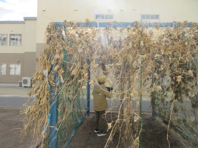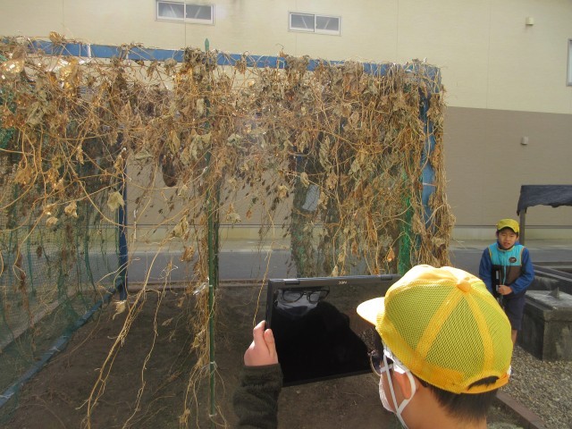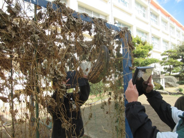 4年生の授業の様子です。ヘチマの観察をしています。1年間を通して、成長の様子を観察しています。冬の季節のヘチマ、さあ、どんなことに気が付きましたか?