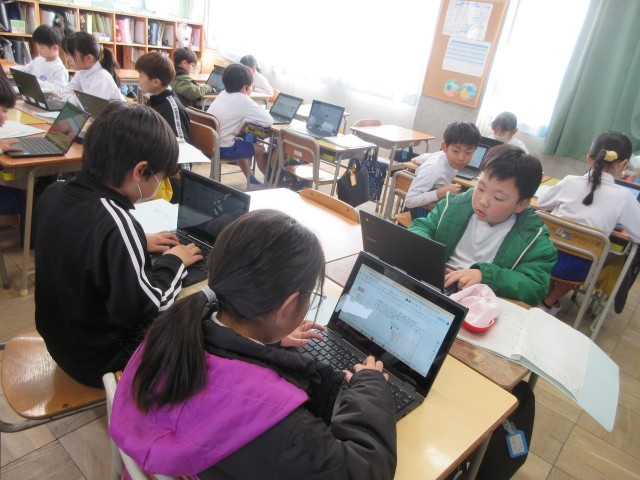 3年生の授業の様子です。総合の授業では福祉について学んでいます。今まで学んだことでわかったことやみんなに伝えたいことを一人ひとりがタブレットを使ってまとめています。