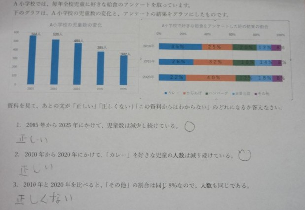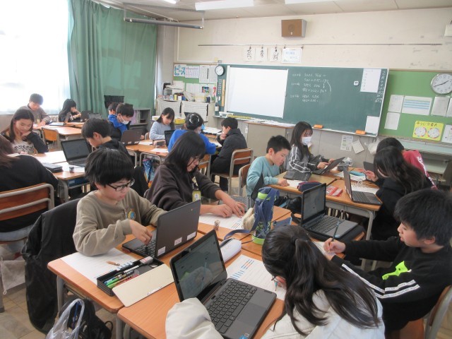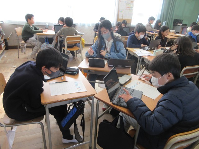 5年生の授業の様子です。算数では複数のグラフを読み取り、わかることを考えるパフォーマンス課題に取り組んでいました。難しい問題にも粘り強く取り組んでいます。自然にグループの中でも相談していましたね。