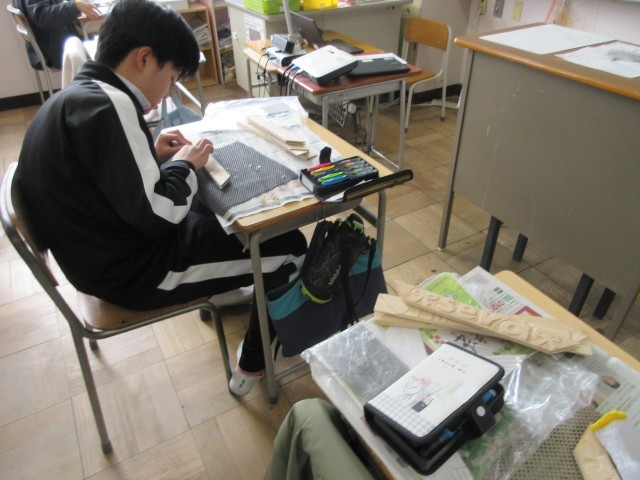 6年生の授業の様子です。図工では卒業制作で色紙を入れるフレームをつくっています。様々な彫刻刀を使って、気に入った模様を切り出しています。みんなよく集中しています。
