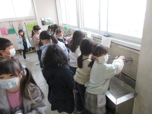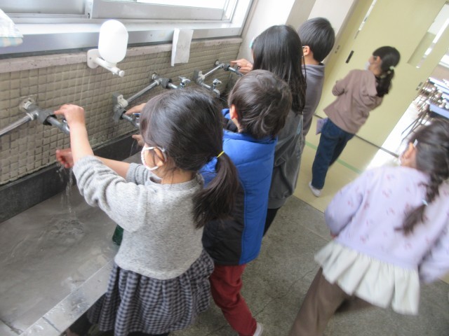 手洗いの一コマです。給食前や放課の後はもちろん、ていねいな手洗いをみんなが心がけています。