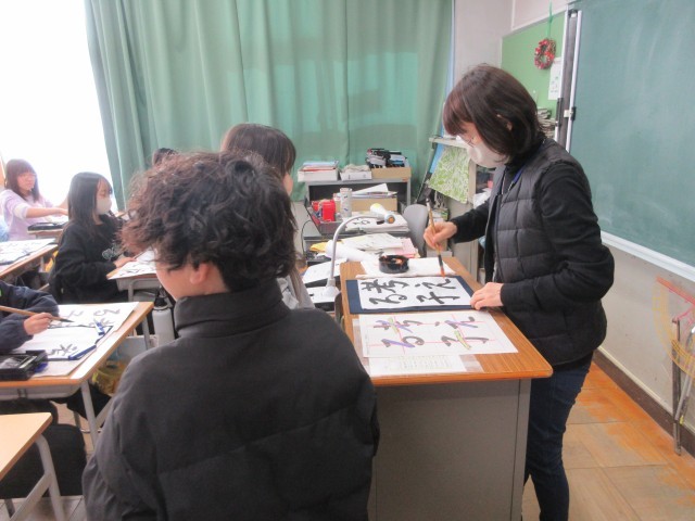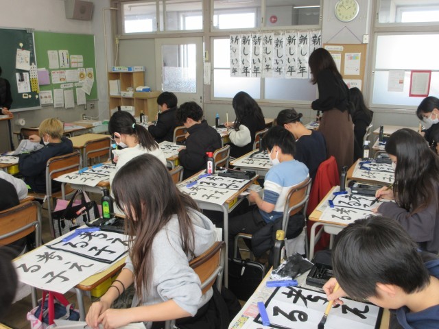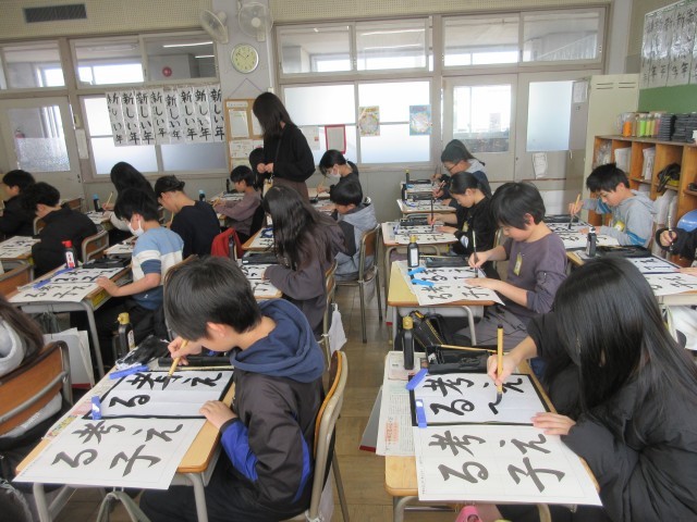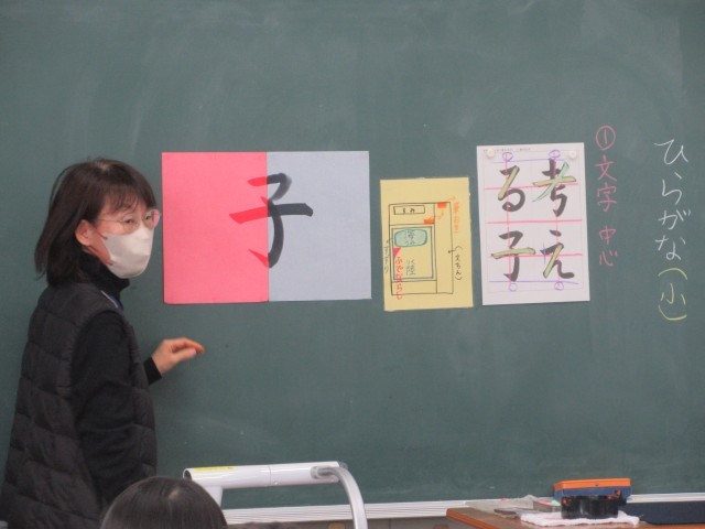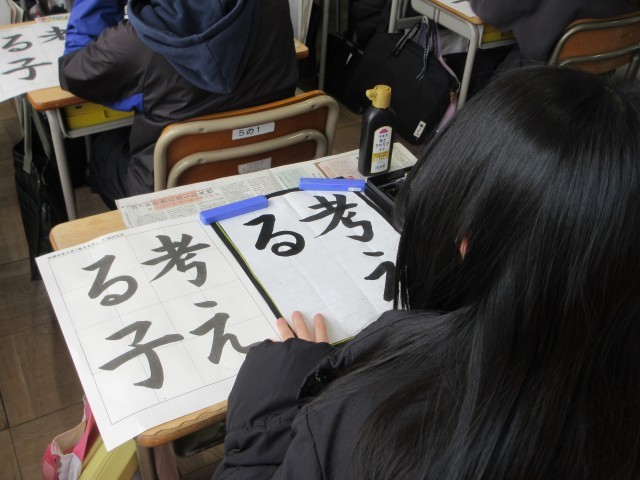 5年生の書の時間の様子です。特別講師の松浦先生と一緒に学んでいます。漢字とひらがなが混ざった難しい課題です。「考える子」の文字は、中心を揃えて書けるように、黒板にお手本を見せていただきましたね。この後、一人一人、出来上がった作品を松浦先生に添削もしていただきました。