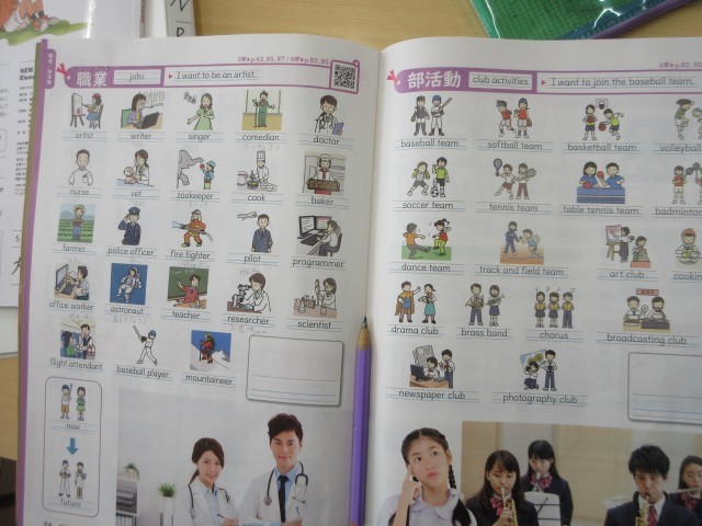 5年生の授業の様子です。外国語の授業では専科の先生とALTのローズ先生といっしょに学んでいます。仕事や職業についてどんな言い方をするのか、お手本をローズ先生に行ってもらいましたね。後につづいてみんなも練習をしています。