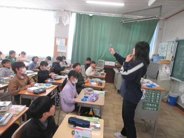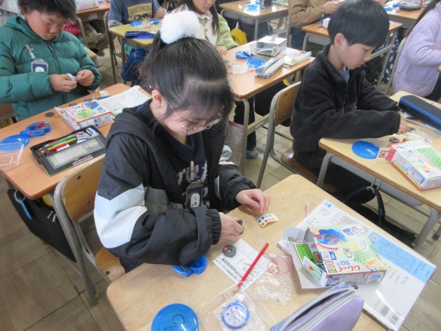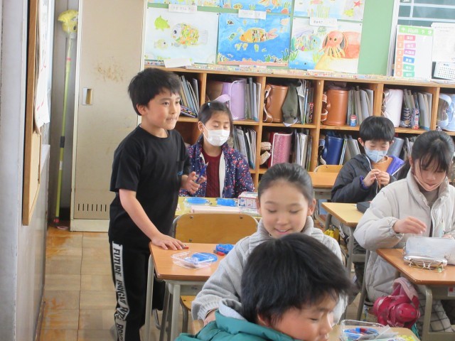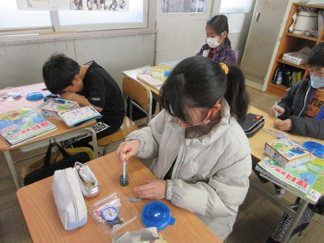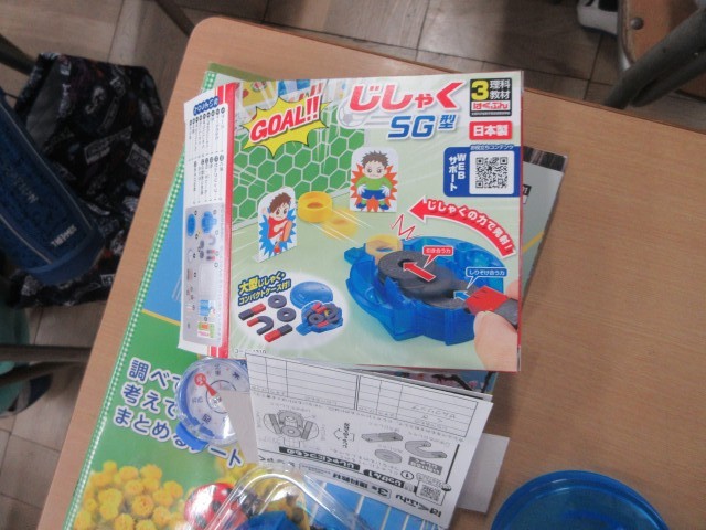 3年生の授業の様子です。理科では磁石のはたらきについて学んでいます。極の書いていない磁石を使って反発したりくっついたりすることを確かめたり、S極とN極を見つける方法を考えたりしましたね。実際に実験できるので早速みんなで考えたことを確かめています。