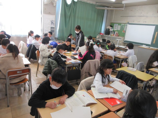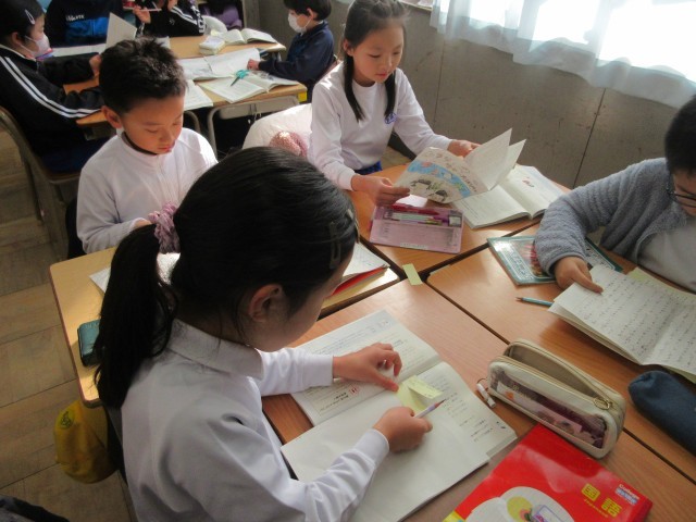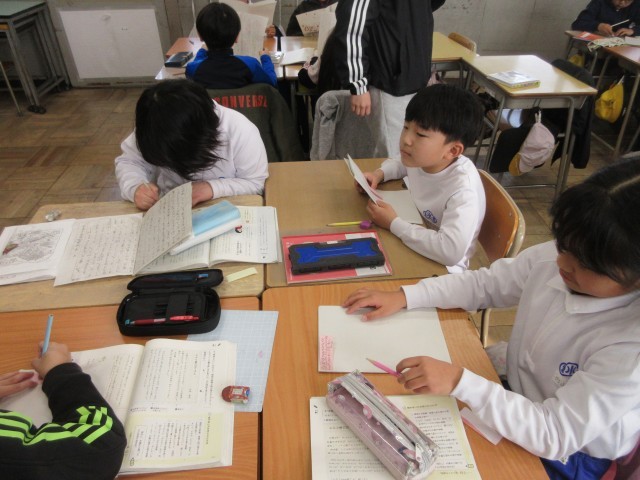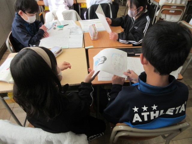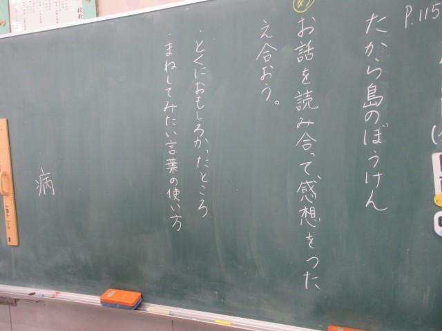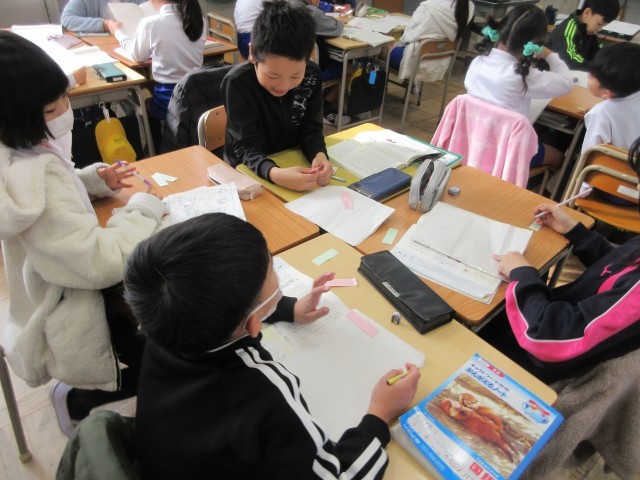3年生の授業の様子です。国語では「たから島のぼうけん」の学習で、友達の作品を読んでいいところを見つけていました。見つけたいいところは、付箋に書いて伝えています。特におもしろかったところやまねしたい言葉の使い方などを具体的に書いていましたね。