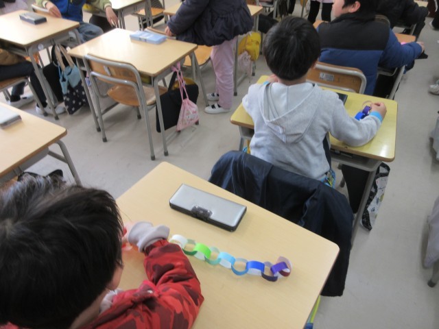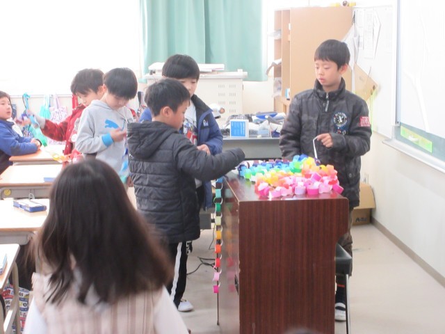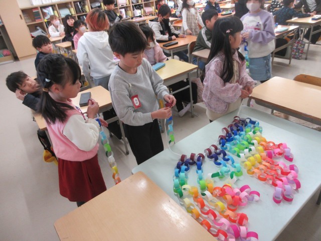 2年生は6年生の卒業をお祝いするための、輪飾りをつくっています。一人ひとりがとても丁寧にのりづけをしてつくっています。みんなの輪飾りが一緒になって、さらにきれいです。