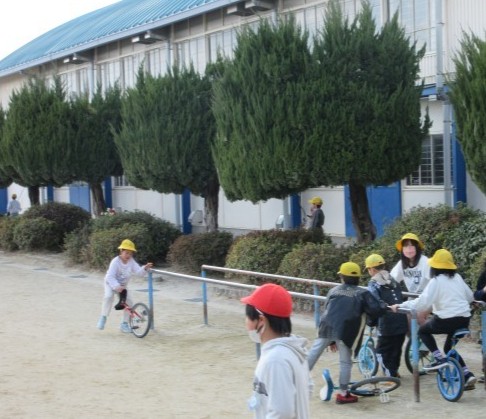 放課の一コマです。一輪車の練習をしている子が大勢います。小野小には体育館前と体育器具庫近くの2か所練習する場所があります。どちらもたくさんの子どもたちで賑わっています。