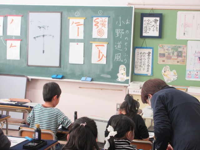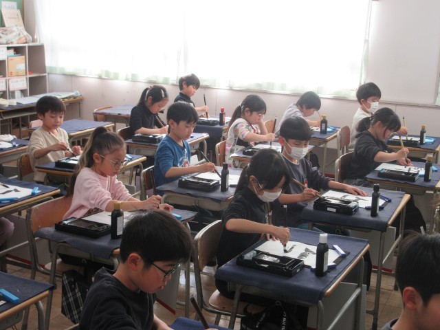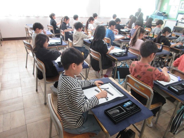 特別講師の吉岡先生と一緒に学んでいます。2年生は墨を使った毛筆に取り組んでいます。ふでの持ち方、姿勢、筆の使い方、試筆などたくさんのポイントを吉岡先生に大きな水書板にお手本を見せてもらいながら丁寧に練習しています。