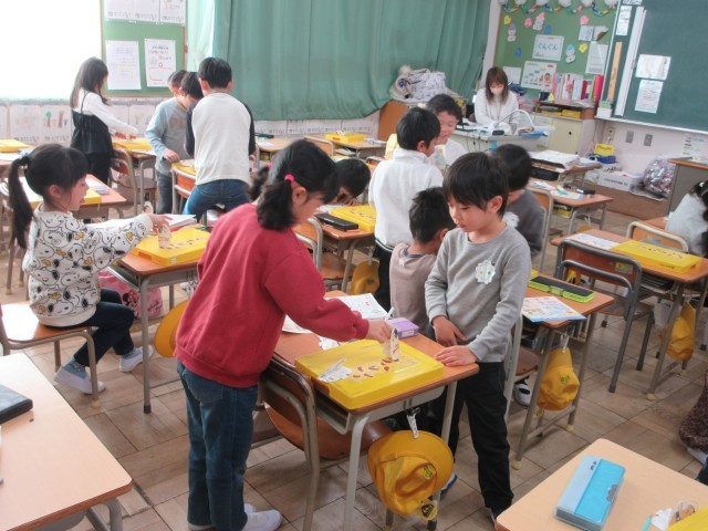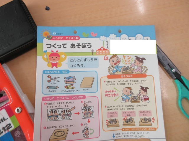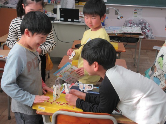 1年生の授業の様子です。生活科では「つくってあそぼう」の学習でとんとんずもうをつくっています。自分で作った作品でさっそくみんなで遊んでいます。