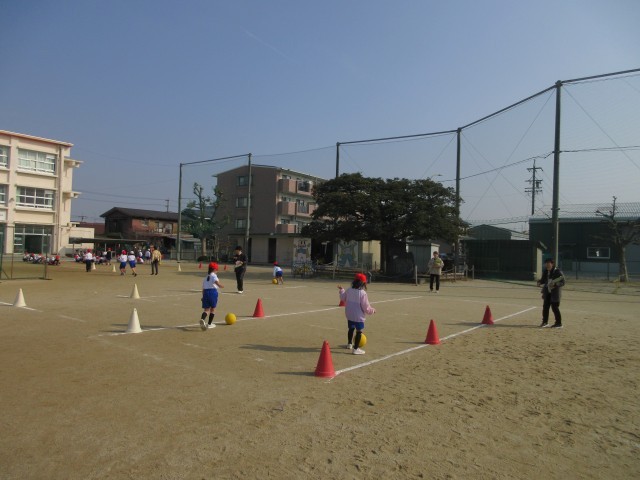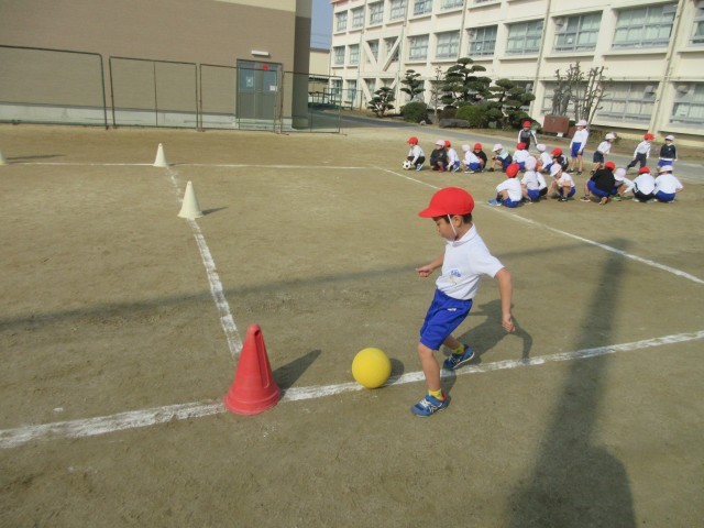 1年生はボールをける運動をしています。コーンとコーンの間をジグザグにぬけていきましたね。ボールと友達になることが出来たかな?