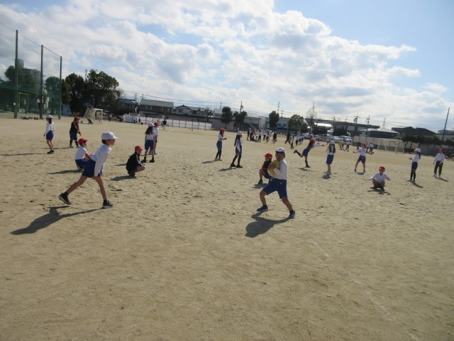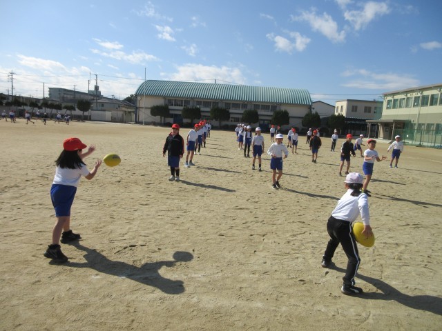 3年生の授業の様子です。タグラグビーのボールを使ってパスの練習をしていました。リレー形式でパスをつなげています。相手にうまくなげるボールのコントロールは難しいですが、根気よく練習しています。