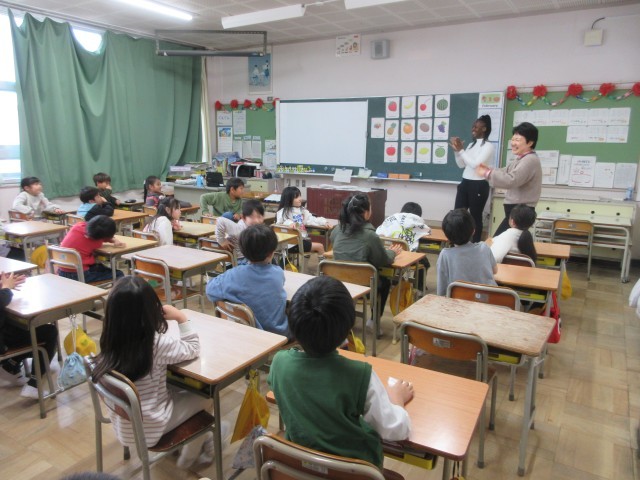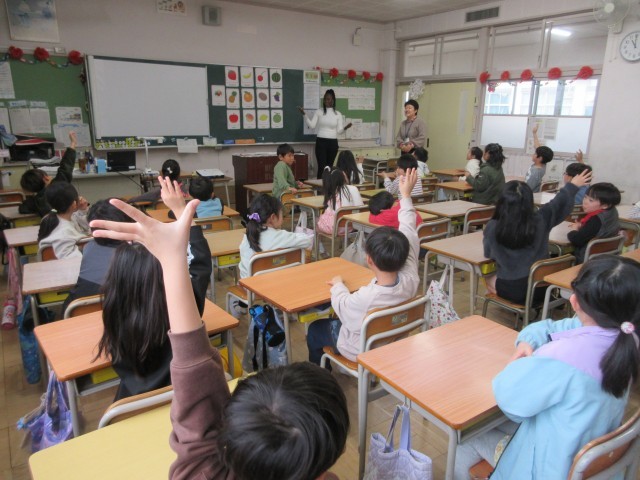 1年生の授業の様子です。ALTのローズ先生と一緒に学んでいます。どんなフルーツが好きなのか?ローズ先生の質問に答えていました。いちご→ストロベリー、りんごは?・・・色々なフルーツの名前を楽しく覚えましたね。