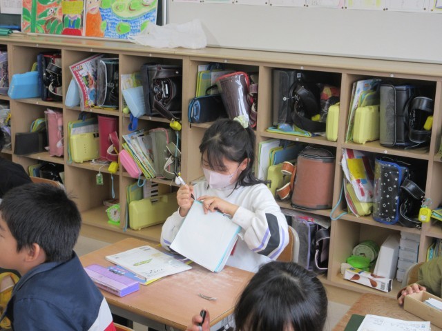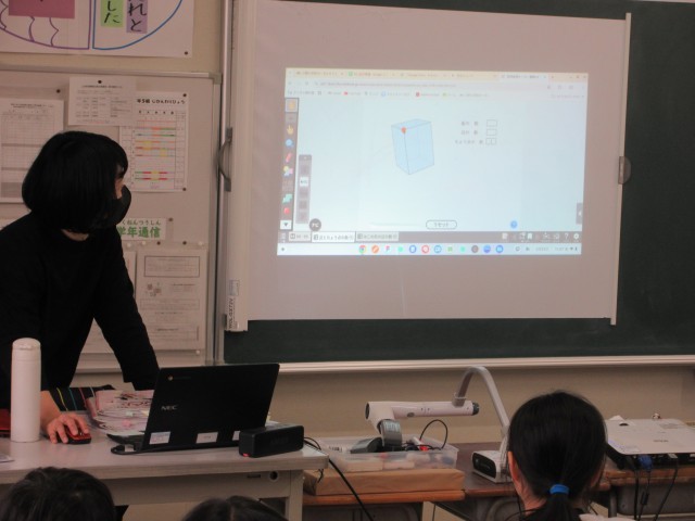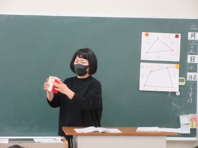2年生の授業の一コマです。算数では箱の頂点、辺の数を実際の箱を使って調べていました。同じ点や辺を重ねて数えないように、しるしをつけながら数を数えていましたね。いくつになったかな?
