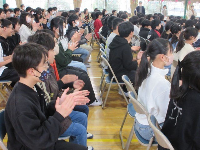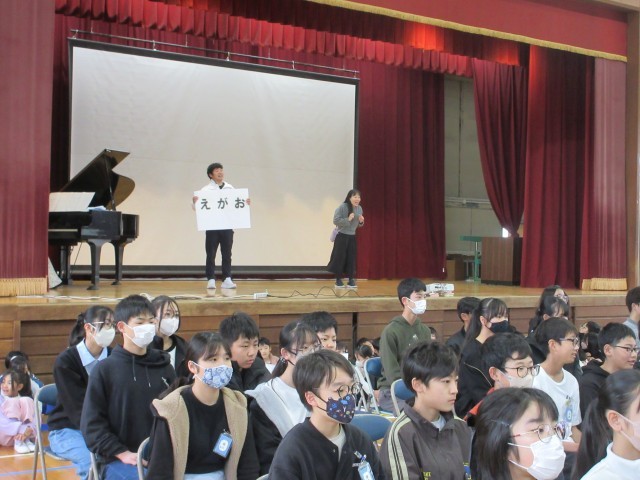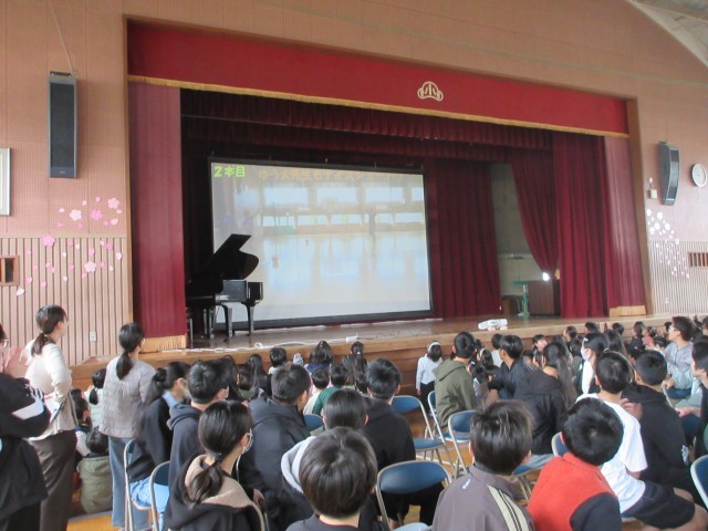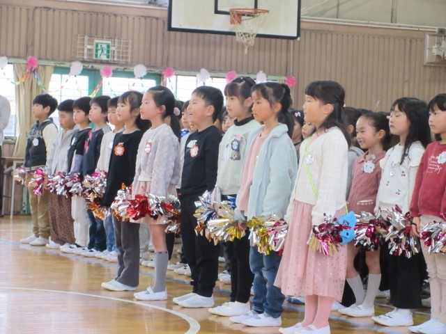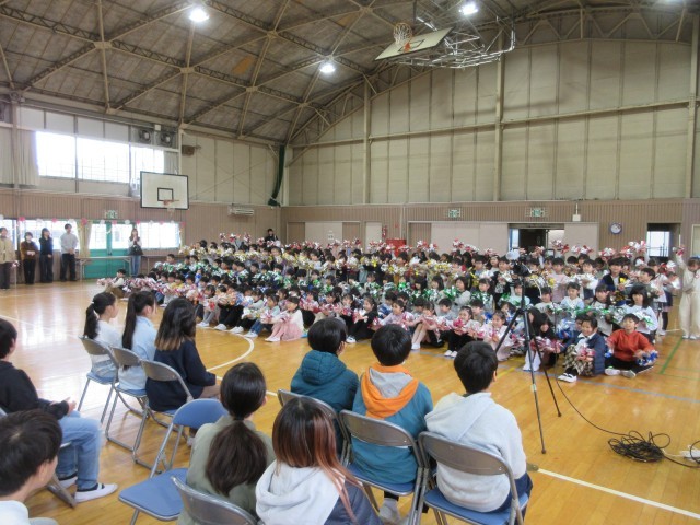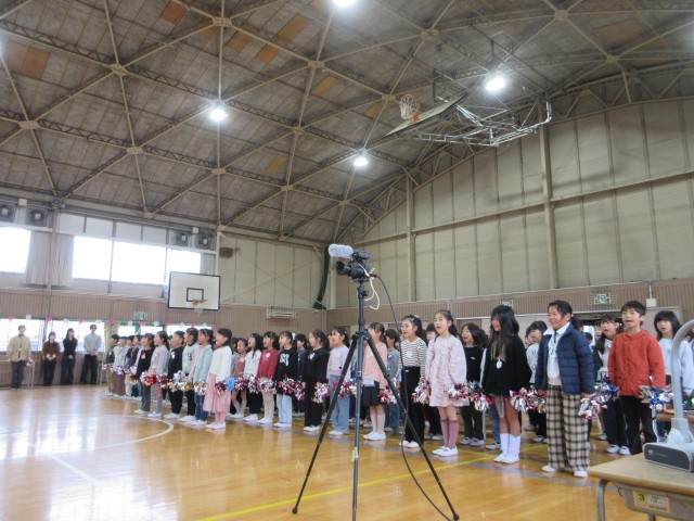 2月26日(木)体育館で行われた卒業生を送る会の様子です。発表学年と6年生、司会の5年生は体育館で、発表していない学年はオンラインや動画を見ながら全校で取り組みました。6年生のために今まで準備をしてきた1年生から5年生までのありがとうの気持ちのこもった出し物、途中の出入りの際には代表委員のみなさんがクイズやじゃんけん大会で6年生に楽しんでもらいましたね。先生方からのスペシャル動画もありました。最後には6年生からの「変わらないもの」の歌のプレゼントとどの場面も心温まる素敵な送る会になりました。ここからはほんの一部です名場面を紹介します。