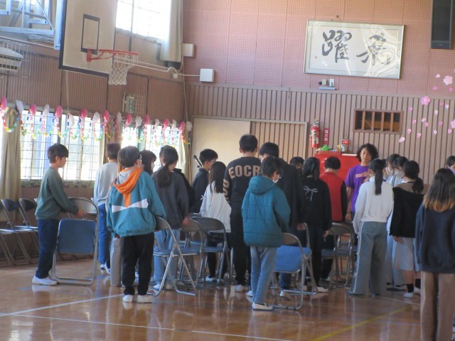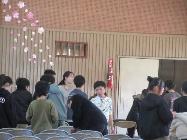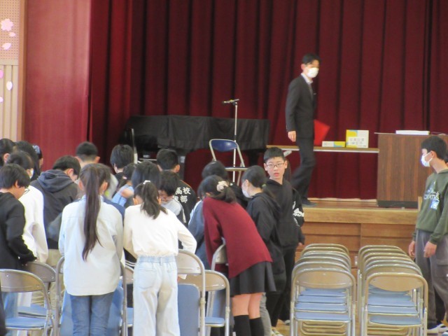 2月26日(木)卒業生を送る会の後、体育館は卒業式の会場へとモデルチェンジしました。6年生が会場準備をしました。そして今日から行われる1回目の卒業式練習に向けての第一歩を踏み出しました。日々の卒業式の練習を積み重ね、心と身体を整えていきましょう。