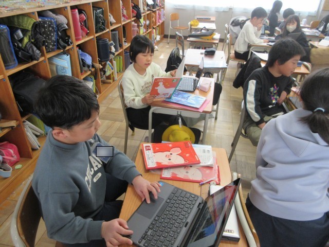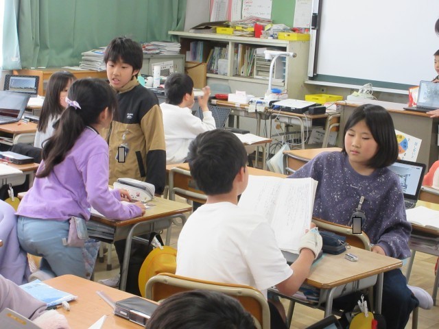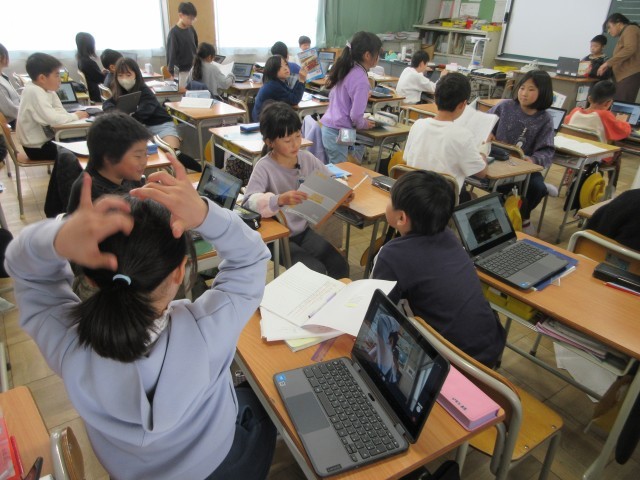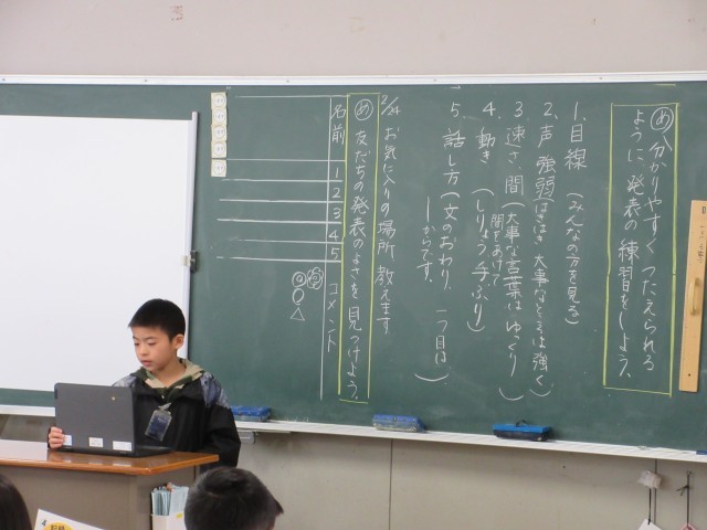 3年生の授業の様子です。国語では、わたしのお気に入りの場所を紹介します。クラスのみんなの前で発表する前に近くの友達に聴いてもらって練習をしていました。この後がお気に入りの場所の写真を見せながら発表します。