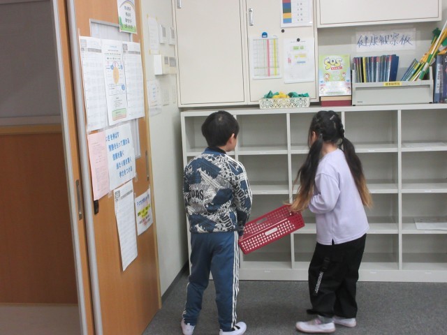 毎朝職員室に、クラスボックスに配布物をとりに来るみなさんがいます。毎日のお仕事がんばっています。入り口では元気にあいさつができる子がとても多くて感心です。これからも、朝のお仕事がんばってくださいね。