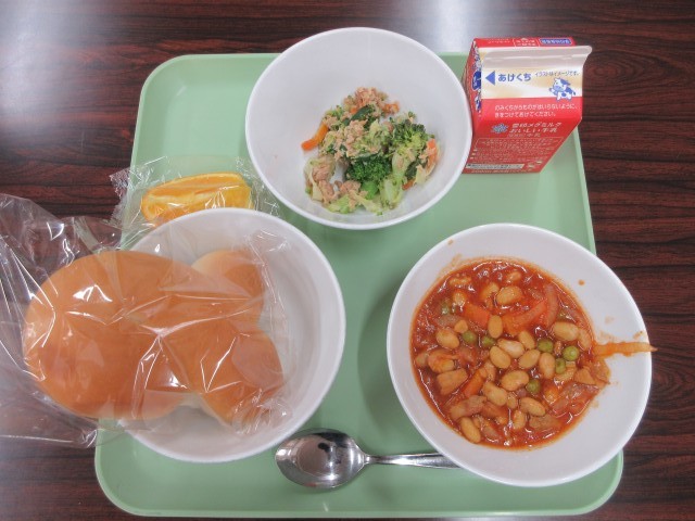 3月23日(月)今日の給食一言話は「クロスロールパン、牛乳、ポークビーンズ、ブロッコリーサラダ、オレンジ」です。みなさんは食事の時に心をこめて「いただきます」「ごちそうさま」と言っていますか?みなさんが食べ物を食べるまでに、いろいろな人がかわり働いています。また、食べ物は、動物や植物の命をいただくことでもあります。いつも感謝の気持ちを忘れないようにしましょう。