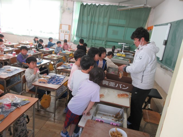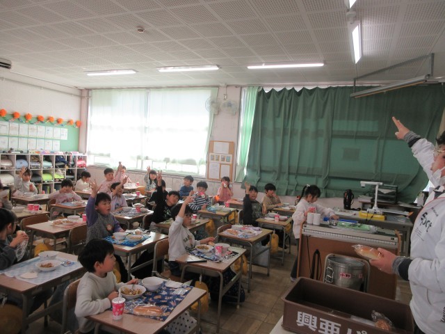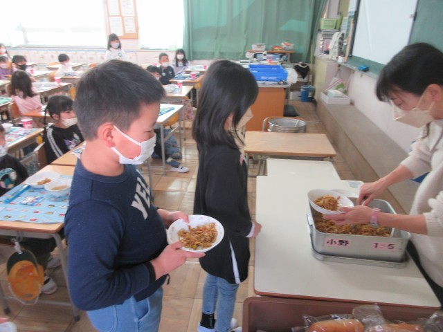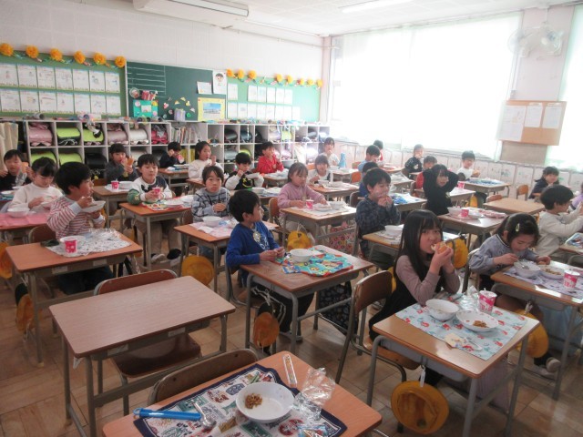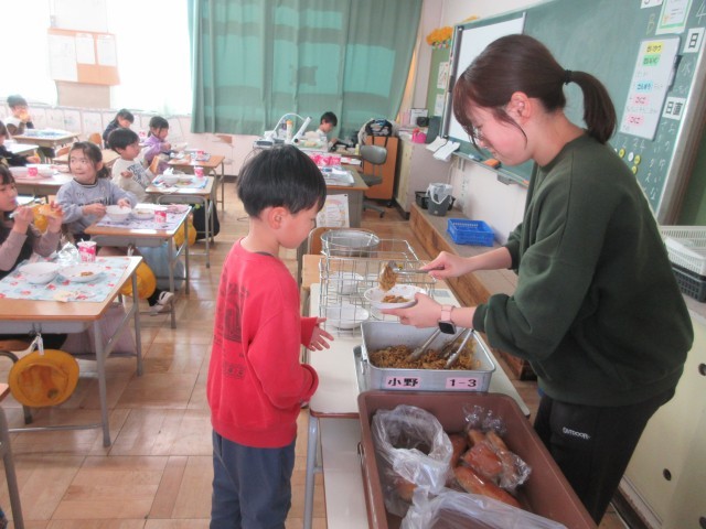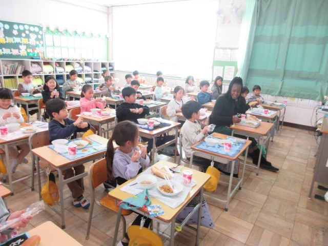 1年生の給食の一コマです。準備や給食の食事、おかわりの様子など色々な教室を見に行きました。ローズ先生と一緒に給食を食べているクラスもありましたね。どの教室も落ち着いて、食事をしていました。給食をバランスよく食べて、心も身体もすこやかに成長してくださいね。