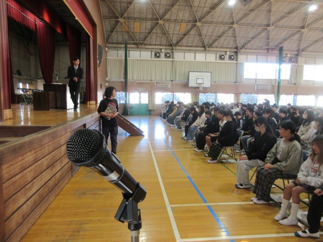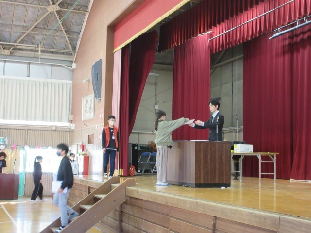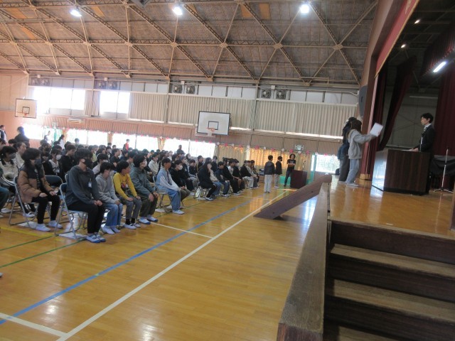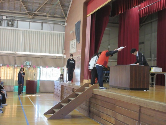 卒業式の学年練習の一コマです。今回は卒業証書を一人ひとり受け取る練習をしました。145人のみなさんが全員動きの確認をしました。卒業証書を受け取る前の動き、受け取った後の動きもありますね。舞台の上、フロア、中央の赤絨毯の階段を通る、返事や礼をするタイミング一緒に動く人と揃えるなど出番はたくさんあります。体育館で実際に練習する機会は限られているので、1回1回を大切にしましょう。返事や礼は普段の日常生活でも気をつけていくといいですね。