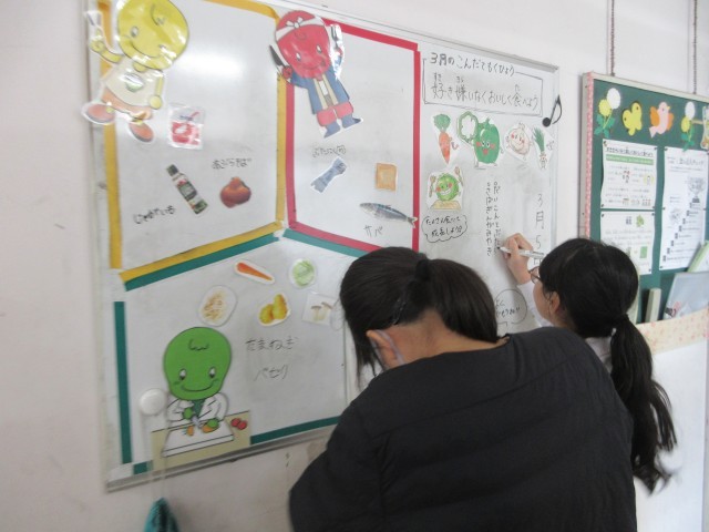 毎日給食委員会のみなさんが、本館1回保健室前の食育掲示板の張り替えをしています。いつも小野っ子のみんなのために給食の栄養について紹介してくれてありがとう。